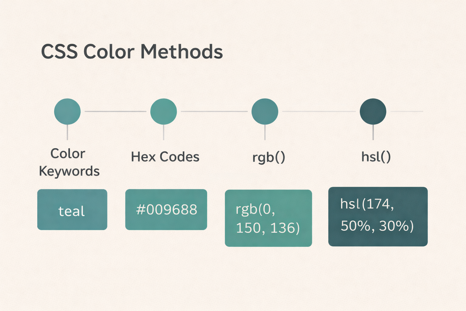 در CSS، چهار روش اصلی برای تولید رنگ وجود دارد که هرکدام مزایا و کاربرد خاص خود را دارند. در این آموزش با شیوه استفاده از کلمات کلیدی رنگ، مقادیر هگزادسیمال، فرمت rgb() و فرمت hsl() آشنا میشوید. تمام این روشها را روی یک ساختار HTML آزمایش خواهیم کرد تا تفاوت و کاربرد هر روش را بهتر درک کنید. در طی آموزش با خواصی مثل color، border و background-color کار خواهیم کرد.
